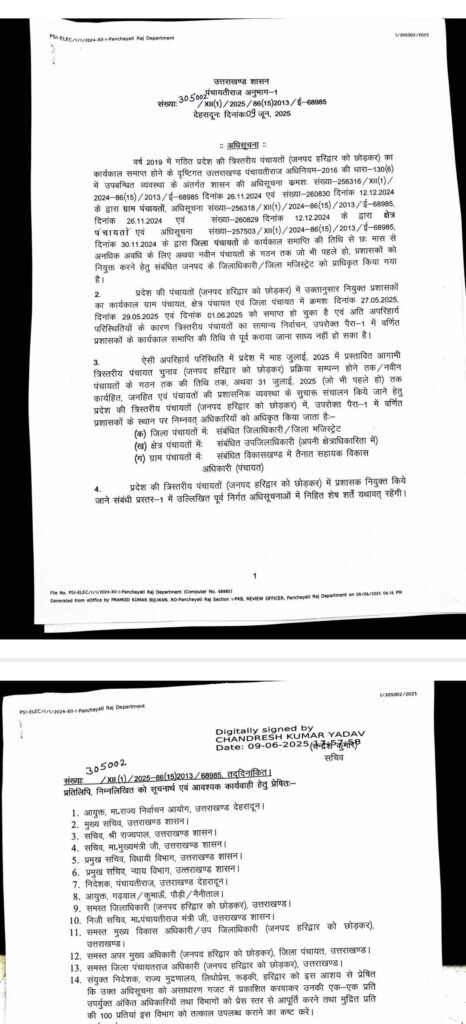 उत्तराखण्ड सरकार ने त्रिस्तरीय पंचायतों में प्रशासकीय व्यवस्था को सुचारू बनाए रखने के उद्देश्य से हरिद्वार को छोड़कर प्रदेश के शेष सभी जनपदों में नई प्रशासकीय नियुक्तियों की घोषणा की है। यह निर्णय पंचायतीराज अधिनियम-2016 की धारा 130(6) के अंतर्गत लिया गया है, जिसके तहत त्रिस्तरीय पंचायतों—ग्राम पंचायत, क्षेत्र पंचायत तथा जिला पंचायत—का कार्यकाल समाप्त हो चुका है।