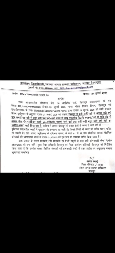 राज्य आपातकालीन परिचालन केंद्र और मौसम विभाग की ओर से 21 जुलाई को देहरादून जिले में भारी से अत्यंत भारी बारिश, तेज गर्जना, आकाशीय बिजली और तेज हवाओं (40–50 किमी/घंटा) की चेतावनी जारी की गई है। इसी के मद्देनजर “ओरेंज अलर्ट” घोषित किया गया है।