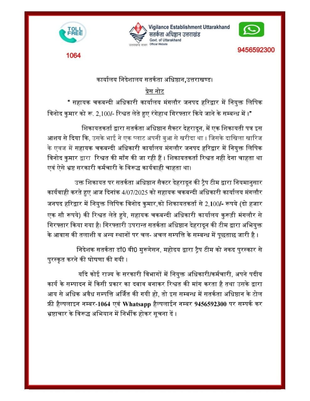 शिकायतकर्ता ने सतर्कता अधिष्ठान, सैक्टर देहरादून को लिखित शिकायत दी थी कि उसके भाई ने अपनी बुआ से एक प्लॉट खरीदा है, जिसके दाखिला-खारिज के एवज में लिपिक विनोद कुमार रिश्वत की मांग कर रहा है। शिकायतकर्ता रिश्वत देने के पक्ष में नहीं था और भ्रष्टाचार के विरुद्ध कार्रवाई चाहता था।