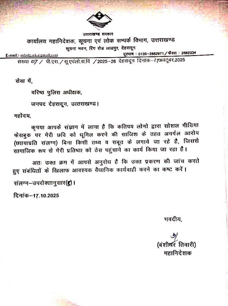 उत्तराखंड के सूचना महानिदेशक IAS बंशीधर तिवारी ने अपने खिलाफ सोशल मीडिया पर चल रही भ्रामक और आधारहीन खबरों को लेकर सख्त कदम उठाया है। उन्होंने एसएसपी देहरादून को औपचारिक शिकायत दर्ज कराई, जिसमें उन्होंने इस दुष्प्रचार अभियान से जुड़े पुख्ता डिजिटल सबूत भी सौंपे हैं।