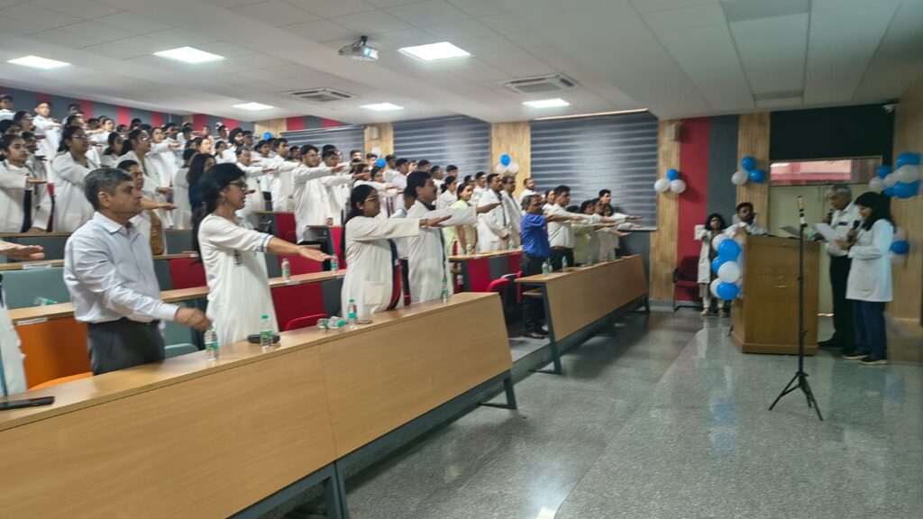 महानिदेशक (शैक्षणिक विकास) प्रो. (डॉ.) विजेंद्र चौहान ने विद्यार्थियों को चिकित्सकीय जीवन की चुनौतियों और अवसरों के प्रति प्रेरित किया। उन्होंने कहा कि यह पेशा केवल ज्ञान का नहीं, बल्कि निरंतर सीखते रहने और समाज की निस्वार्थ सेवा करने का मार्ग है।
