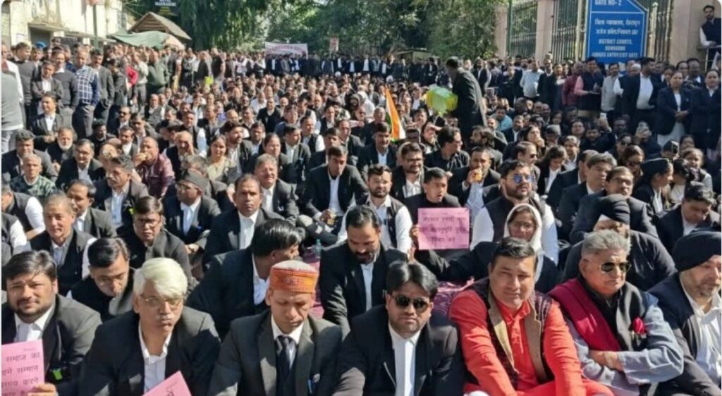 6 नवंबर से अधिवक्ता अपनी मांगों को लेकर देहरादून की सड़कों पर सांकेतिक जाम कर प्रदर्शन कर रहे हैं. सोमवार को अधिवक्ताओं ने सुबह 10:30 बजे से 11:30 बजे तक (एक घंटा) का सांकेतिक जाम रखा. जबकि मंगलवार को सुबह 10:30 बजे से दोपहर 12:30 बजे तक (2 घंटे) का सांकेतिक जाम किया. इसी क्रम में पिछले पांच दिनों में अधिवक्ताओं ने धीर-धीरे चरणबद्ध तरीके से अपना आंदोलन जारी रखा है. वहीं आज अधिवक्ता के पूरे दिन के लिए हड़ताल पर बैठ गए हैं. साथ ही आज की हड़ताल में प्रदेश के बार एसोसिएशन ने भी दून बार एसोसिएशन का समर्थन किया है.