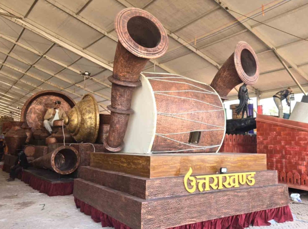 • झांकी का अग्र भाग पारंपरिक वाद्य यंत्रों ढोल और रणसिंघा की तांबे की प्रतिकृतियों से सुसज्जित है, जो उत्तराखंड की गहरी सांस्कृतिक जड़ों और स्थानीय शिल्पकारों की कुशल कारीगरी को दर्शाता है।